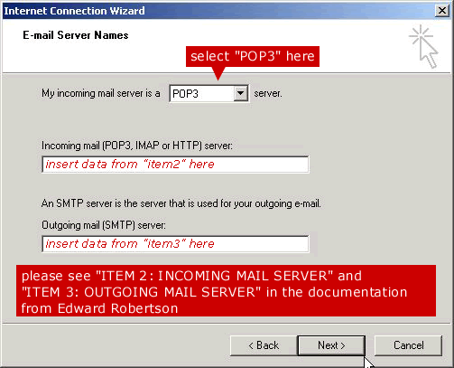 5. Select a Server Type and enter the Incoming Mail Server (item2) and Outgoing Mail Server (item 3) from the documentation