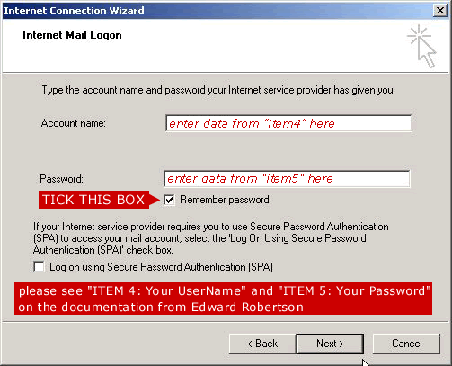6. Enter the Username (item 4) and Password (item 5) from the Edward Robertson documentation and check the box marked "remember password"
